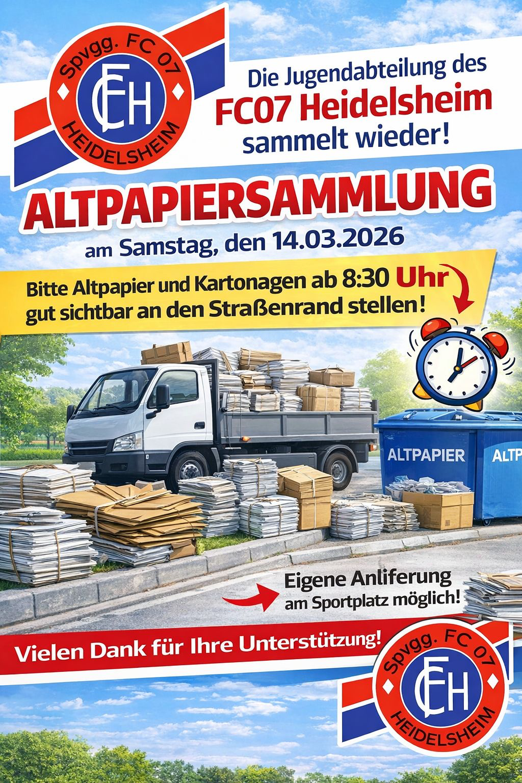 Die nächste Altpapiersammlung der FCH-Jugendabteilung findet am Samstag, 14.3.2026 ab 8:30 Uhr statt. Bitte beachten Sie, dass Kartonagen auch wieder gesammelt werden.