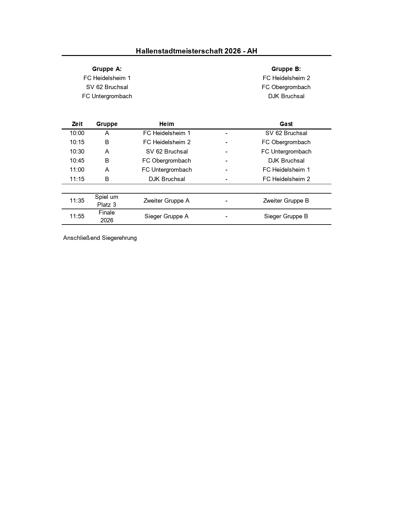 Los geht es bereits um 10.00 Uhr mit der AH-Konkurrenz. Hier treten insgesamt sechs Teams in zwei Vorrundengruppen an, wobei der FC 07 Heidelsheim als Titelverteidiger an den Start geht. Die jeweils Gruppenzweiten bestreiten dann um 11.35 Uhr das Spiel um Platz drei und vier, während um 11.55 Uhr die beiden Gruppensieger im Finale den Titel unter sich ausmachen werden. Die Spielzeit beträgt jeweils einmal 12 Minuten. Gleich anschließend findet die Siegerehrung statt.