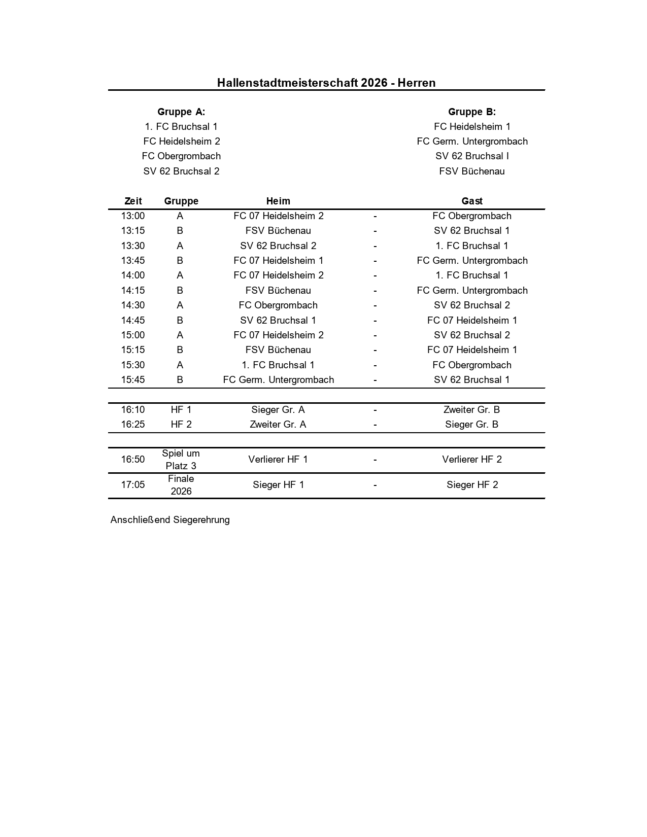 Kaum sind die Theateraufführungen der Laienschauspielgruppe gleich zu Beginn eines jeden neuen Jahres vorbei, da geht es bei der Sportvereinigung FC 07 Heidelsheim schon wieder munter und fleißig weiter, denn diese ist bekanntlich am kommenden Sonntag, 11. Januar 2026 Ausrichter der diesjährigen Bruchsaler Hallenstadtmeisterschaften für Senioren und AH-Mannschaften in der Bruchsaler Sporthalle.